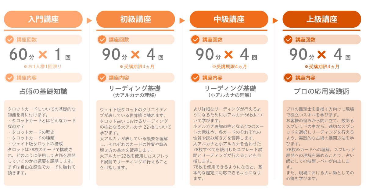 各カードの基本的な説明など、初歩のカリキュラムから順に進んでいきますので、タロット占いの初心者の方でも大丈夫です。